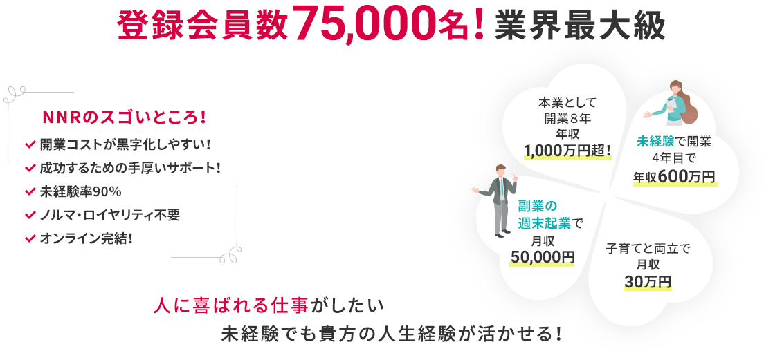 NNRでは加盟時にお支払いする加盟金、毎月連盟にお支払いする月会費をできる限り安価に抑えています。さらに、加盟後の研修費は全額無料。ロイヤリティ等もいただいておりません。開業直後は何かと経費がかかり、売上も少ないため、一番厳しい時期といえます。初期費用と月間費用を安く抑えているNNRだからこそ、継続的に高い利益を出すことができ、事業の早期安定化が見込めるのです。